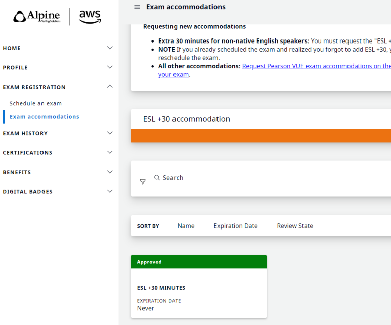 exam accomodation 배너를 찾으셔서 반드시 시험을 응시하기 전에 신청하셔야합니다. 그래야 시험 응시를 할 때 시험시간 영역에 30분이 추가되어서 신청이 됩니다.